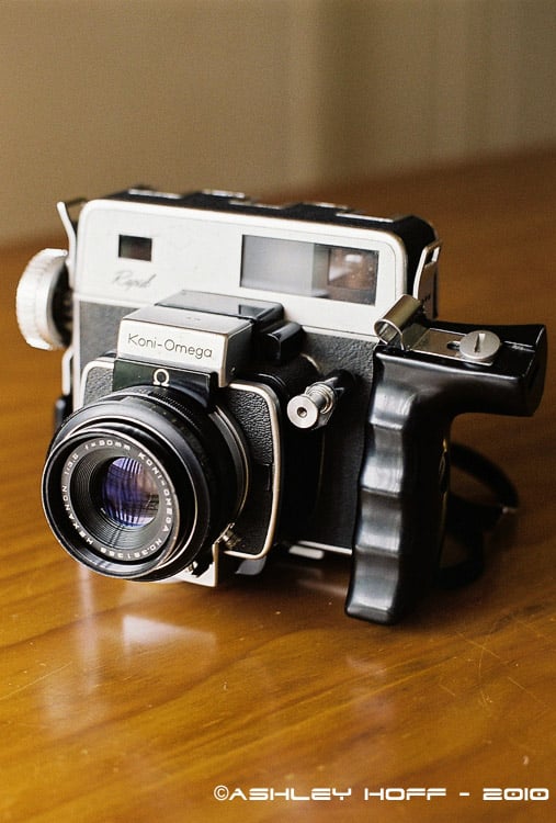 In 1954, Simmon Bros. N.Y., known for their line of enlargers, released the Omega 120 — a 6x7cm rangefinder camera with a 90/3.5 Omicron lens. The design of this camera was later acquired by Konica, which then produced a line of rangefinder press cameras that could capture ten exposures on a roll of 120 and 20 exposures on a roll of 220.