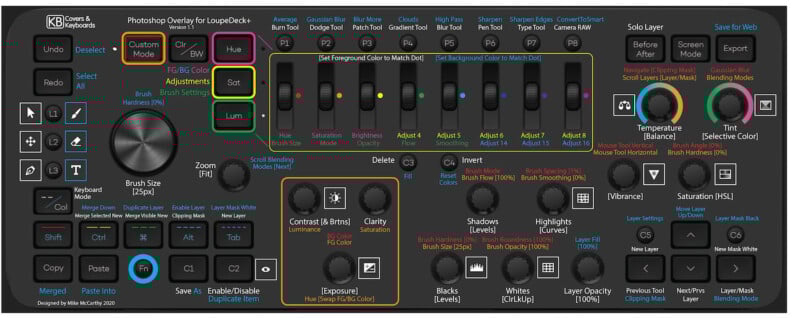 While the buttons and dials are labeled out of the box, Mike McCarthy — post-production engineer on Act of Valor and Need for Speed, among many other films — created custom overlays for the Loupedeck+. These can be purchased at KB Covers & Keyboards, with stock options for Adobe Photoshop, Lightroom, After Effects, Audition, Premiere Pro, and Final Cut Pro. There is also an option to purchase a customized overlay. The overlays complement and cover the existing permanent labeling, and they are easily swappable for users who need different overlays for multiple applications.