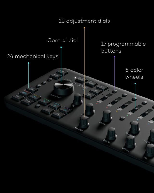 The Loupedeck+ takes up a lot more room than all the other options here, measuring 17.8 x 8.3”, so it is perhaps no surprise that it contains no less than 24 mechanical keys, 13 adjustment dials, 17 programmable buttons, 8 wheels, and a large control dial.
