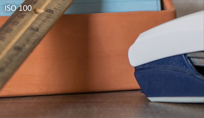 Here is a closer look at a cropped section of the scene at ISO 100, ISO 800, and ISO 6400.