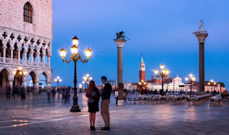 This photo was also taken on Saint Mark’s Square. This time, it completely ignores the “rule of odds” several times in the frame. There are two principal human subjects, four street lamps, and two ornate columns, all even numbers.