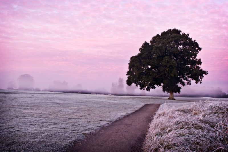 This simple landscape photograph makes use of negative space. The misty morning actually helped obscure some of the background elements making the tree on the left really stand out with little to distract from it.