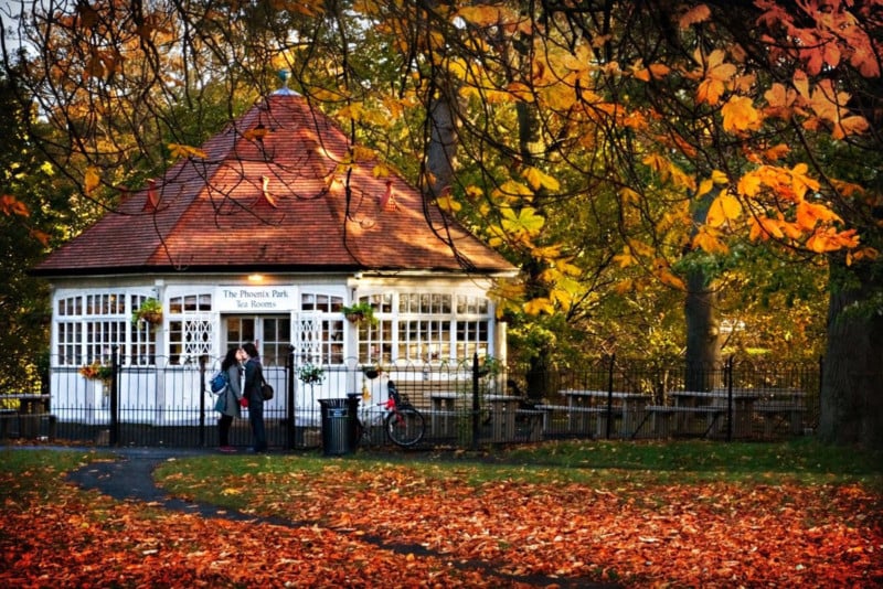 Sometimes capturing the “decisive moment” can be a case of being in the right place at the right time. In this case, I had already set up my camera to photograph the old tea rooms in the Victorian Era Phoenix Park in Dublin. As I was waiting, a young couple entered the frame and said goodbye with a tender kiss in front of the doors to the tea rooms. Patience and luck both play a role in capturing the “decisive moment” in your photographs.