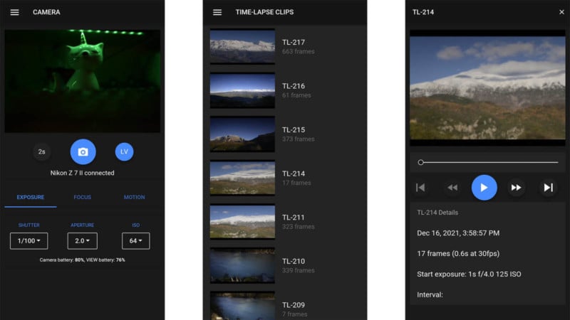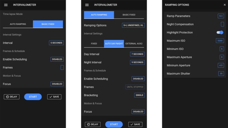 With this device, you have the ability to set different intervals for the same sequence. For example, a separate interval during daytime and another one for nighttime while checking the histogram and the exposure levels in real time. Some models have also the ability to show a low-resolution preview of the captured timelapse sequence on the device and the dedicated remote smartphone app (check images below) without having to stop capturing.