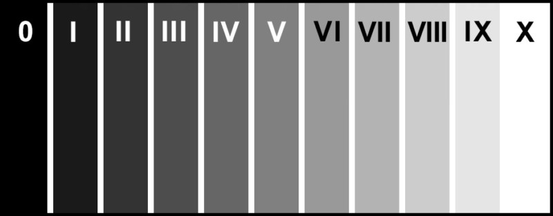 A simple explanation for the Zone System is metering for the shadows and developing for the highlights. The zone step chart below shows the zone values with Roman numerals. Each step equals ‘one stop’ of light change. We will reference these values when metering during the pre-visualization step. I have a zone sticker on my meter that I use for quick reference, and recommend something similar when metering for zone values.