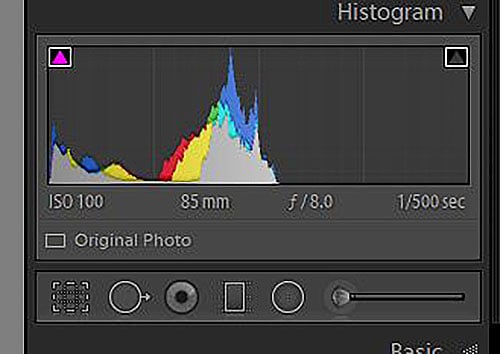 The reason Adobe calls them clipped becomes clear when you look at the histogram which plots (in grey) the average combined RGB brightness of every pixel in the whole image; the peaks show the most common brightness values.
