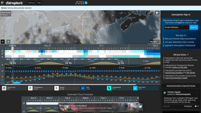 - Astrospheric.com. Free forecasts for the US & Canada only which include visual graphics of cloud cover, smoke, and other astrophotography specific criteria.