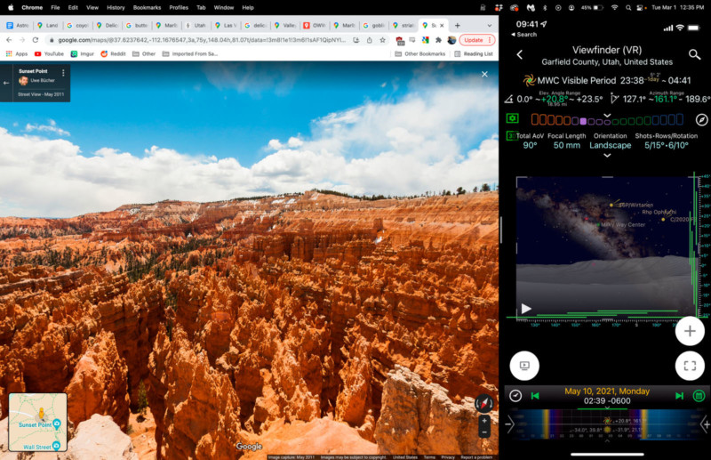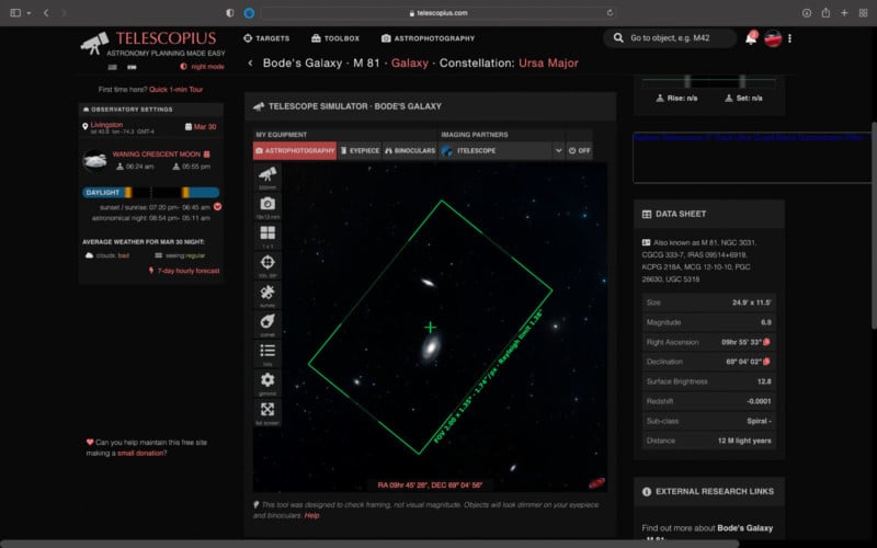 Additionally, use PhotoPills and Planit to figure this out. Each app has a planner mode that tells you this information. The disadvantage here is the smaller phone screen and lack of a full “planetarium style” view may make it difficult to determine when targets rise and set. PhotoPills has a specific function for the Milky Way core, Moon, and Meteor showers, while Planit also allows you to type in some popular nebula and galaxies as well.