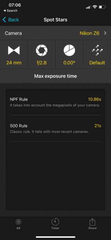 To calculate this, we use the NPF Rule. You may have heard of the 500 rule, but as digital sensors have progressed that rule became less relevant. The NPF is super precise and takes into account the many parameters of your specific setup. Both PhotoPills and Planit Pro have this function built in, or use the calculator here.