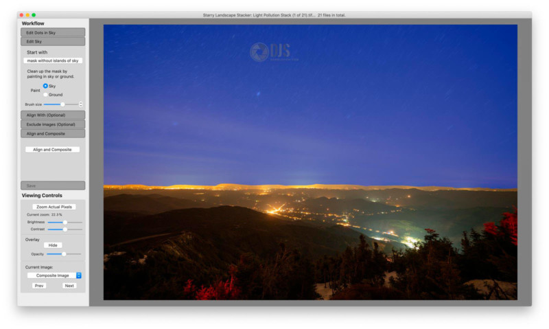 The stacked nightscape: Now I would introduce software light StarryLandscapeStacker or Sequator. First, I would use LR for a bit of pre-processing. Then, I would stack. Then I would bring either back into LR to finish it up or Photoshop for deeper processing.