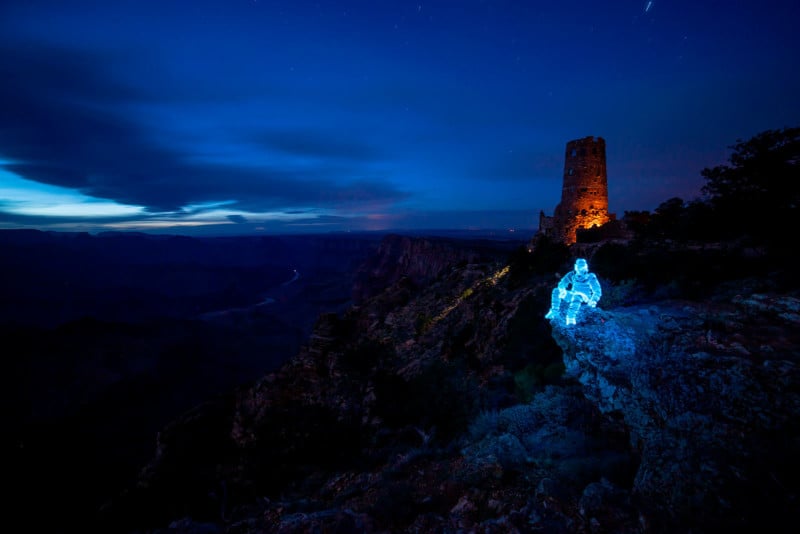 One thing to keep in mind when creating an illuminated being is that it’s important to pick a position that will be easy for you to hold for the entire exposure. Listed below are the tools that I used, the camera settings, and the total exposure time.
