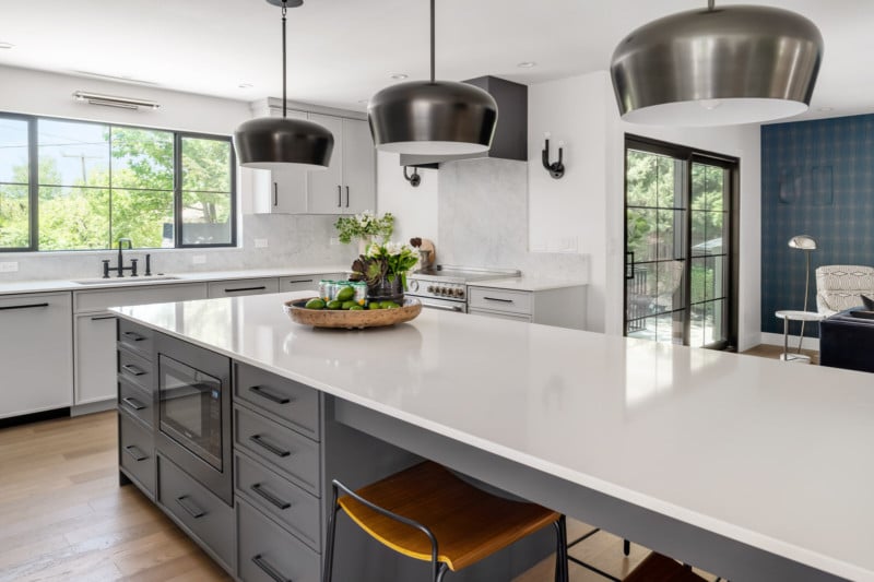 I used two flashes in this instance, one handheld behind my camera in real estate photography’s infamous “Statue of Liberty pose”, and one placed on a counter behind the wall to illuminate the adjacent space.