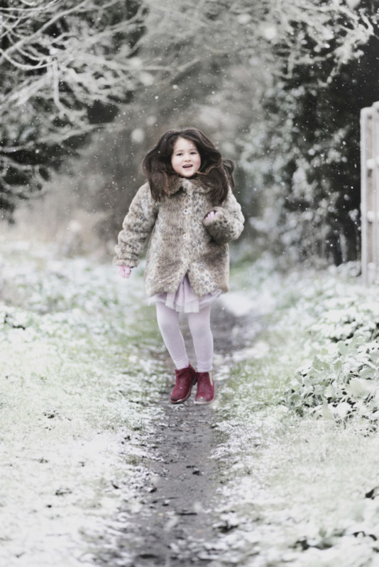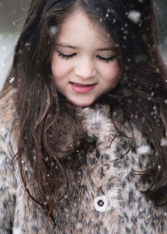 In the first photo, I am trying to control all aspects of the shot I was taking, but my daughter wasn’t impressed. In the second photo, I zoom in and take a natural shot of her as she watches the snowflakes fall. Which one do you prefer?
