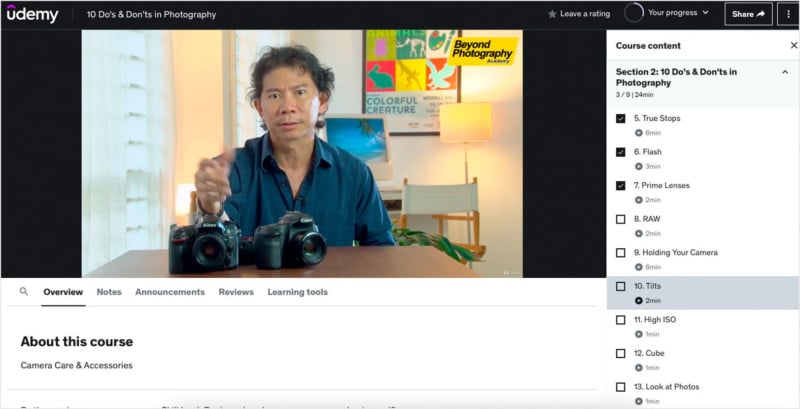 Once you’ve gone through the first few modules, you’ll move on to the biggest dos and don’ts in photography. The teacher is entertaining and informative in equal measure, making it easy to follow along.