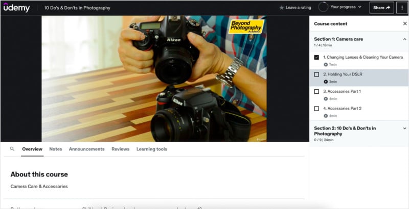 This course was developed by the user Beyond Photography. Before you learn about the specific dos and don’ts, you’ll pick up a couple of basics – such as cleaning your camera and changing your lenses. The program refers largely to DSLR devices, but much of what you learn is also applicable if you have a mirrorless camera.