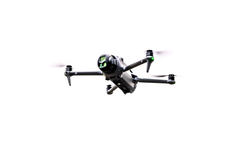 The biggest change to the Mavic 4 Pro is a brand new gimbal design that houses the three cameras. With a flick of a switch, the gimbal can turn 90 degrees sideways to give full-width vertical video. This on its own isn’t revolutionary, but the gimbal can also smoothly rotate the cameras to provide “Dutch tilts” or smoothly spin the entire horizon while recording video clips. This allows for some mind-bending scenes that deeply immerse the viewer into the scene. The new gimbal design reminds me of a WW2 ball-mount turret but provides a larger amount of coverage. For example, the gimbal can now be pointed upwards from the horizon to around 70 degrees, and also provides more movement without running into the limits of the gimbal traverse than previous versions. This extra coverage allows for more dynamic tracking shots of subjects above or below the drone before the gimbal reaches its limitations.