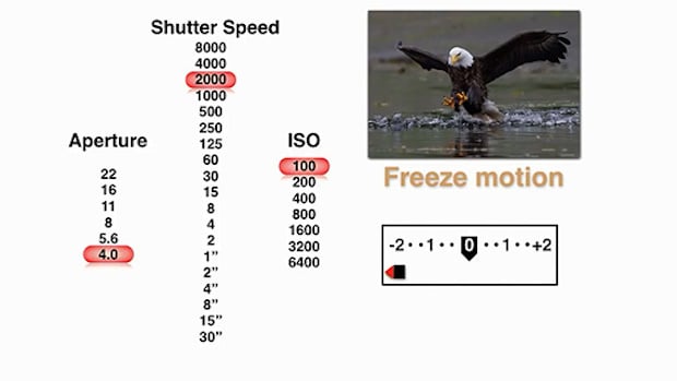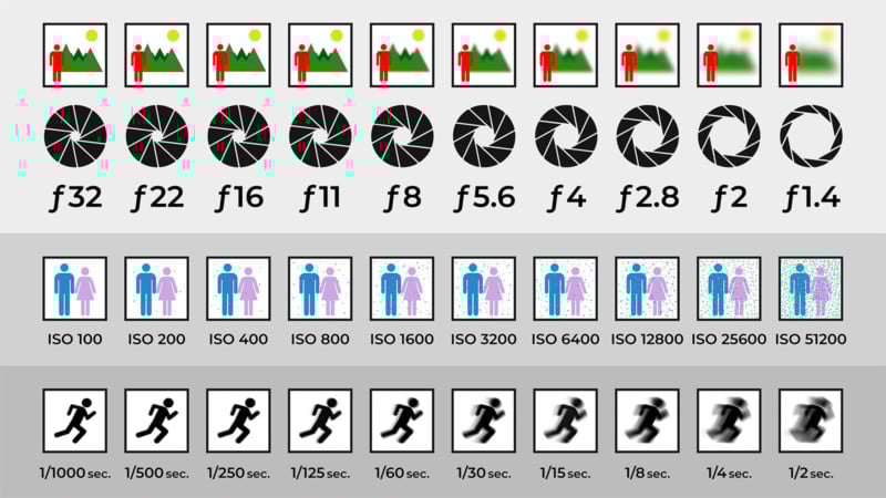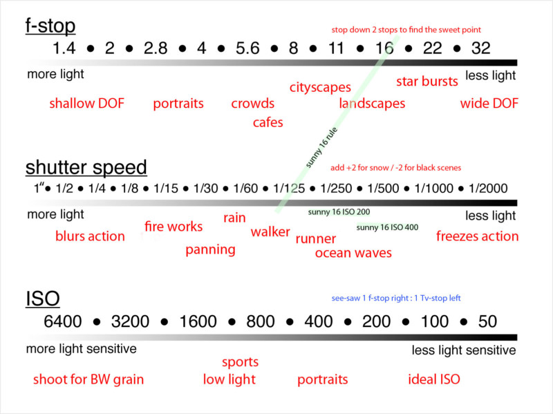 Here is a handy chart that shows full-stop intervals of aperture, ISO, and shutter speed: