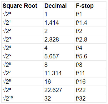 In reality, the progress of f-stops is a simple geometric sequence: the powers of the square root of two (or the square root of the powers of two). Here is the sequence laid out: