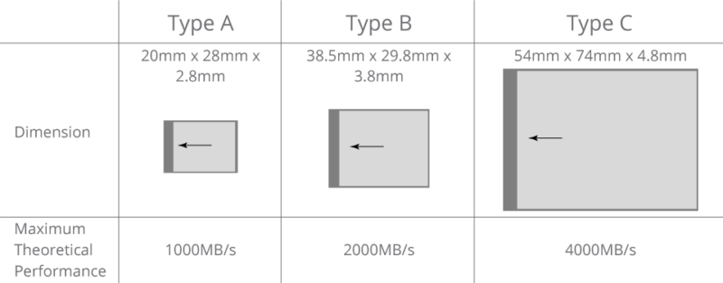 Type A is the smallest and most compact — about the size of an SD card — and supports speeds up to 1 GB/s via a single PCIe 3.0 lane. Type B, using the same pins as XQD, is slightly larger and equipped with a second PCIe 3.0 lane, allowing for up to 2GB/s (double the speed of XQD). And Type C is, naturally, the largest and thickest of the bunch, with a total of four PCIe 3.0 lanes and up to 4GB/s.