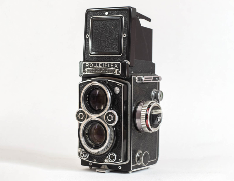 These cameras get their name from the two lenses on the front of the camera. Similar to a 35mm rangefinder, the TLR (“twin-lens reflex”) camera has a lens for viewing and composing the image and one that takes the picture. A big advantage over a 35mm camera is that the viewfinder does not go black when the shutter is tripped.