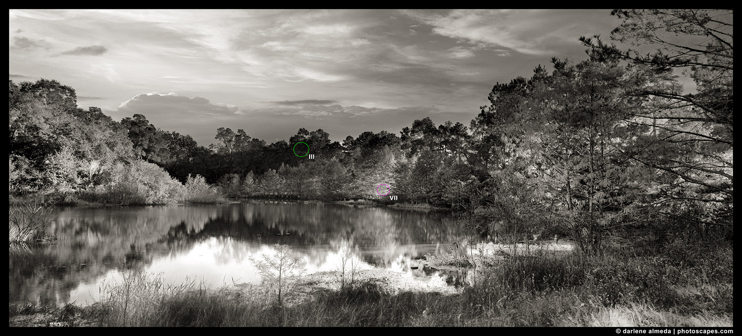 The zone values III, V, and VII are the deciding zones I concern myself with the most. Zone III is where the darkest tone with detail is. Zone V is middle grey (think Kodak’s 18% grey card). Zone VII is where the lightest tone with texture is. Zone II is almost black and Zone VIII is almost paper white. I treat zones outside of III through VII as accent tones and do not expect detail from them. For example, specular highlights should fall into Zones IX and X.