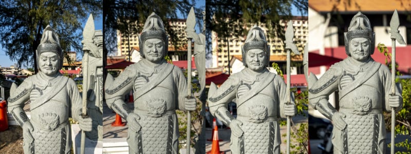 As for compression, we can clearly see background objects appearing closer when I readjusted my position to keep the subject (the warrior) framed in the relatively same position in the frame using the telephoto.