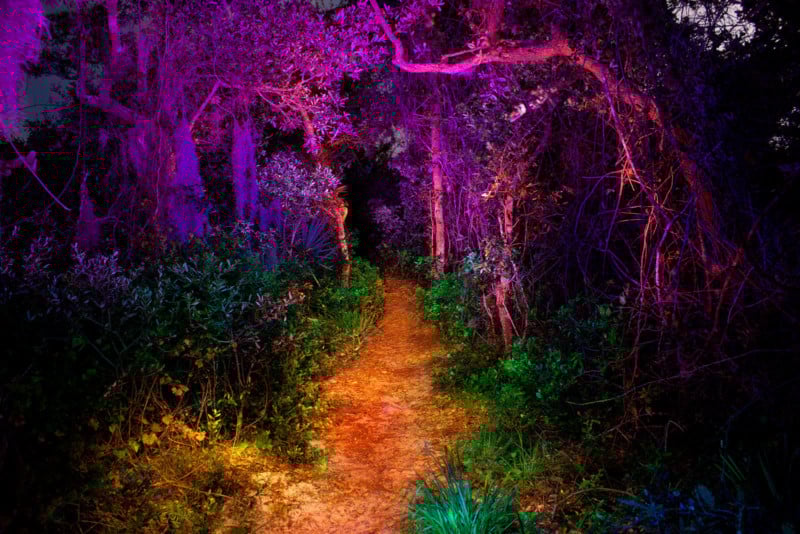 To light paint the image above I start the exposure and do the exact same thing that I did in the first image with one extra step. I walk through the scene flooding the environment with light using the yellow and orange lights fitted with hoods.