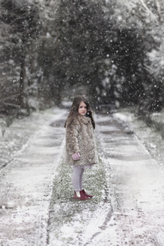 In the first photo, I am trying to control all aspects of the shot I was taking, but my daughter wasn’t impressed. In the second photo, I zoom in and take a natural shot of her as she watches the snowflakes fall. Which one do you prefer?