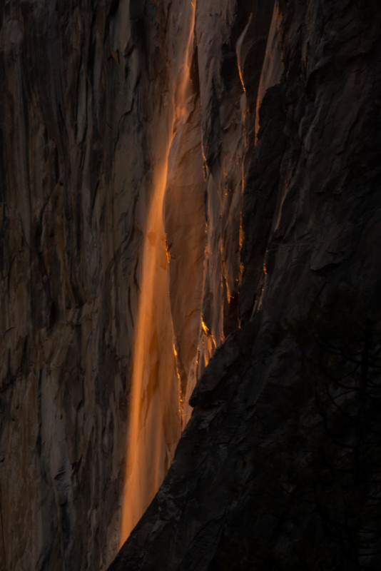 If there are no clouds to the west and the sun is at the correct angle, at sunset, enough sunlight will shoot in to illuminate the mist of the falls, giving an illusion of flowing lava down the face of El Capitan. The waterfall will look like it is on fire (hence the name).