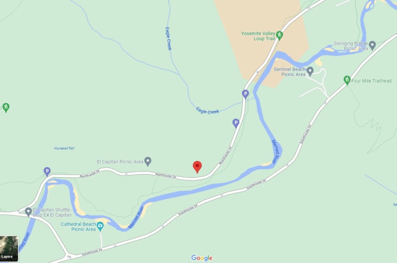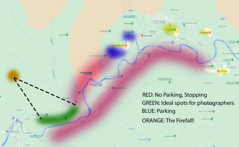 The main road makes a one-way oval through the valley. You will enter on Southside drive, which is closed to stopping and pedestrians, and not an option for any photography. At the end of the valley, the road flips around and turns west to become Northside Drive. It is on Northside Drive you will find Yosemite Lodge and the parking area for Firefall photographers.