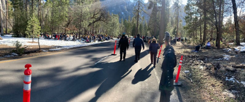 After about a mile, start looking to your right. You will start to see that familiar shape of El Capitan emerging. Don’t worry too much about knowing where the falls will be-it is pretty obvious! The closer you get to the El Capitan picnic area, the more and more people you will see. Now you have to judge where the view and your level of crowd interaction balance. The area around the gentle corner where Northside Drive goes from southwest to west in heading is about the best place to set up.