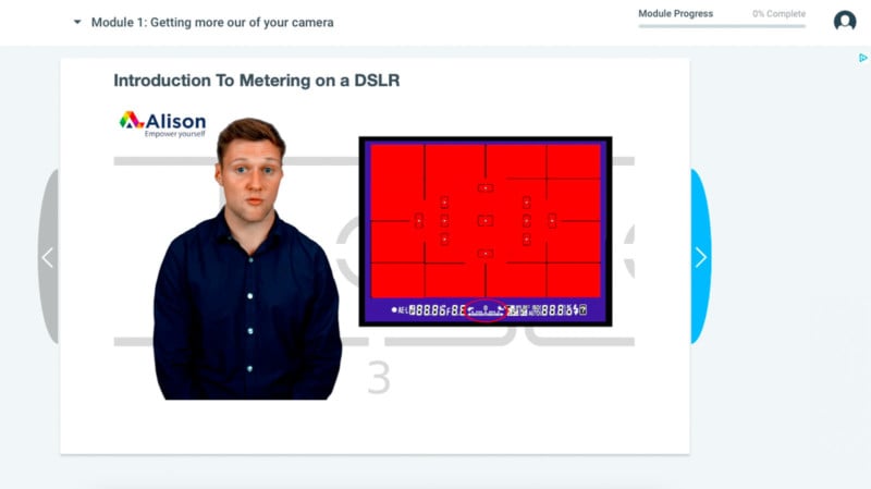 Alison has several free online courses for you to enjoy, including one that focuses on Intermediate Digital Photography. You’ll receive a refresher on the basics you’ll have learned in your early days, such as ISO and shutter speeds – before the presenter discusses more complex tools like camera meters and lens filters.